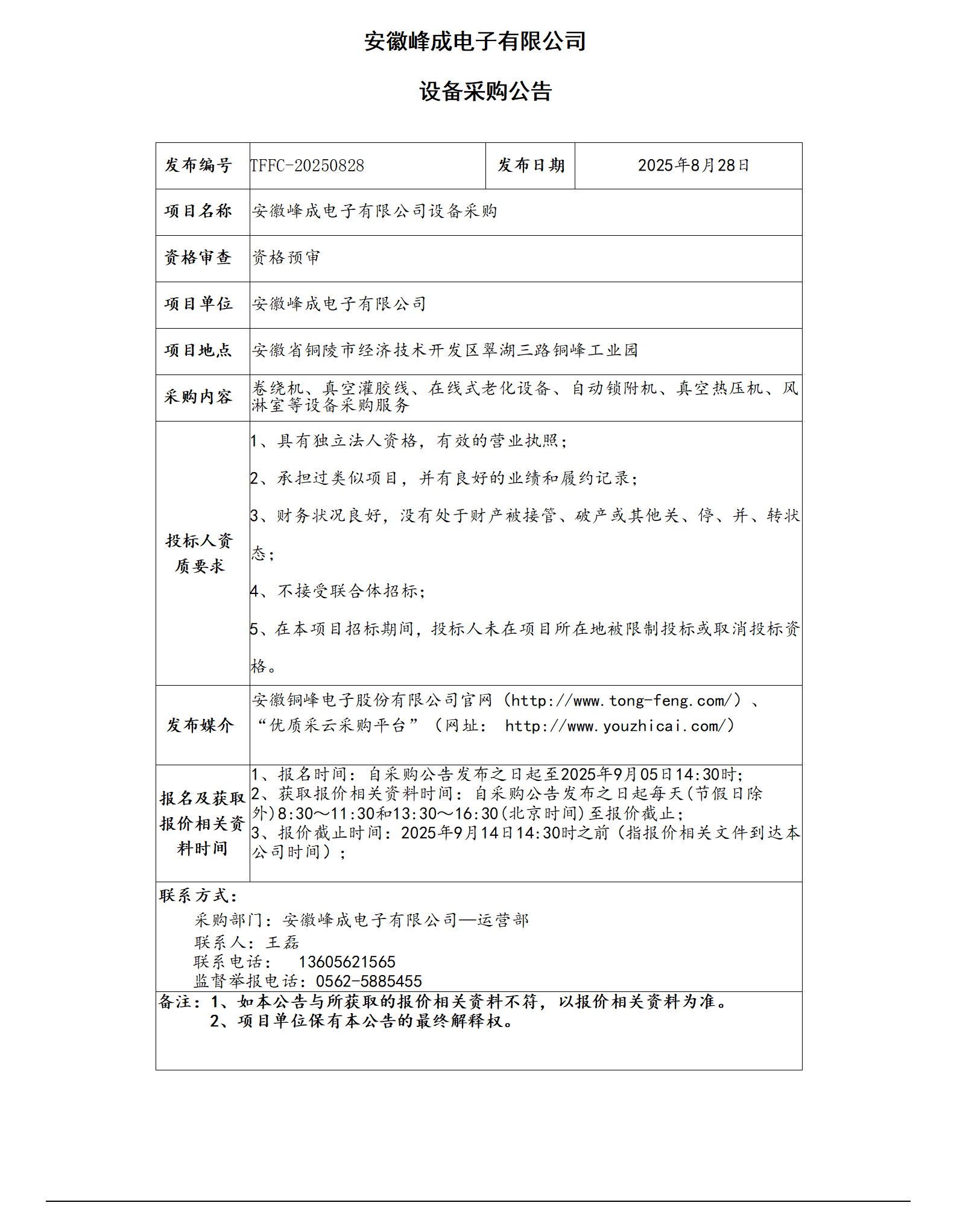 安徽峰成電子有限公司設(shè)備采購(gòu)公告_01