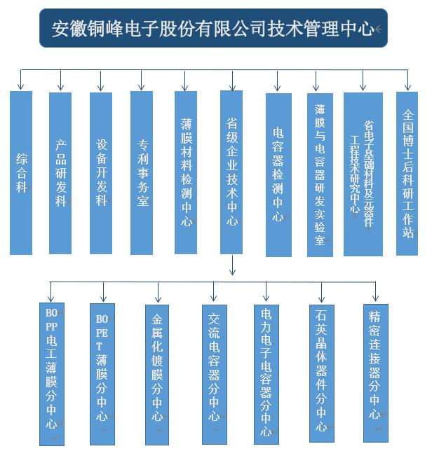銅峰公司為國家高新技術(shù)企業(yè)、國家火炬計(jì)劃重點(diǎn)高新技術(shù)企業(yè)、國家火炬計(jì)劃銅陵電子材料產(chǎn)業(yè)基地重點(diǎn)骨干企業(yè)。公司建有完整的科研創(chuàng)新組織體系,設(shè)立技術(shù)管理中心作為技術(shù)研發(fā)的總管理機(jī)構(gòu),組織協(xié)調(diào)公司的各分子公司和相關(guān)部門,以確保公司技術(shù)創(chuàng)新精確高效地運(yùn)行。技術(shù)管理中心下設(shè)綜合科、產(chǎn)品研發(fā)科、設(shè)備開發(fā)科、專利事務(wù)室、薄膜材料檢測中心、電容器檢測中心以及薄膜與電容器研發(fā)實(shí)驗(yàn)室,同時(shí)下設(shè)省級(jí)企業(yè)技術(shù)中心、安徽省電子基礎(chǔ)材料及元器件工程技術(shù)研究中心以及國家級(jí)博士后科研工作站。