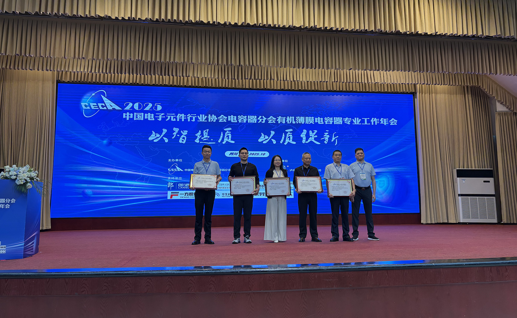 10月14日至17日,中國電子元件行業(yè)協(xié)會電容器分會有機(jī)專業(yè)2025年工作年會在四川瀘州成功舉辦。中電元協(xié)常務(wù)理事、電容器分會第九屆副理事長、公司總經(jīng)理鮑俊華代表公司出席并作主題交流報(bào)告。薄膜分公司獲評電容器分會2025年度“優(yōu)秀供應(yīng)商”榮譽(yù)稱號。